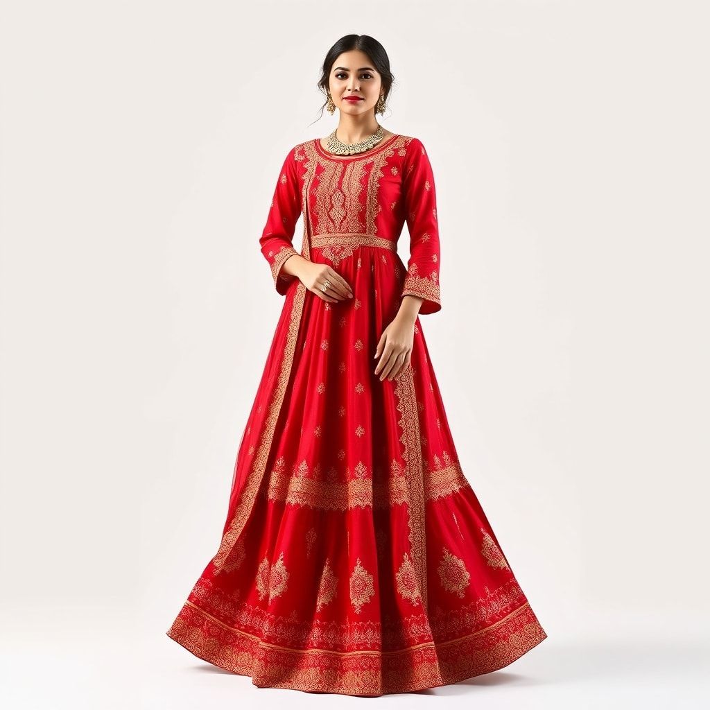 Embrace timeless tradition and exquisite craftsmanship with this magnificent classic red Anarkali salwar kameez. Designed for the discerning woman who appreciates heritage and style, this ensemble is a true masterpiece. The base of the Anarkali is fashioned from a rich, opulent brocade fabric, renowned for its intricate woven patterns and luxurious sheen. This fabric lends a substantial yet graceful drape to the garment, ensuring it moves beautifully with every step. The vibrant, classic red hue is universally flattering and evokes a sense of festivity and celebration, making it an ideal choice for weddings, festivals, and grand gatherings.